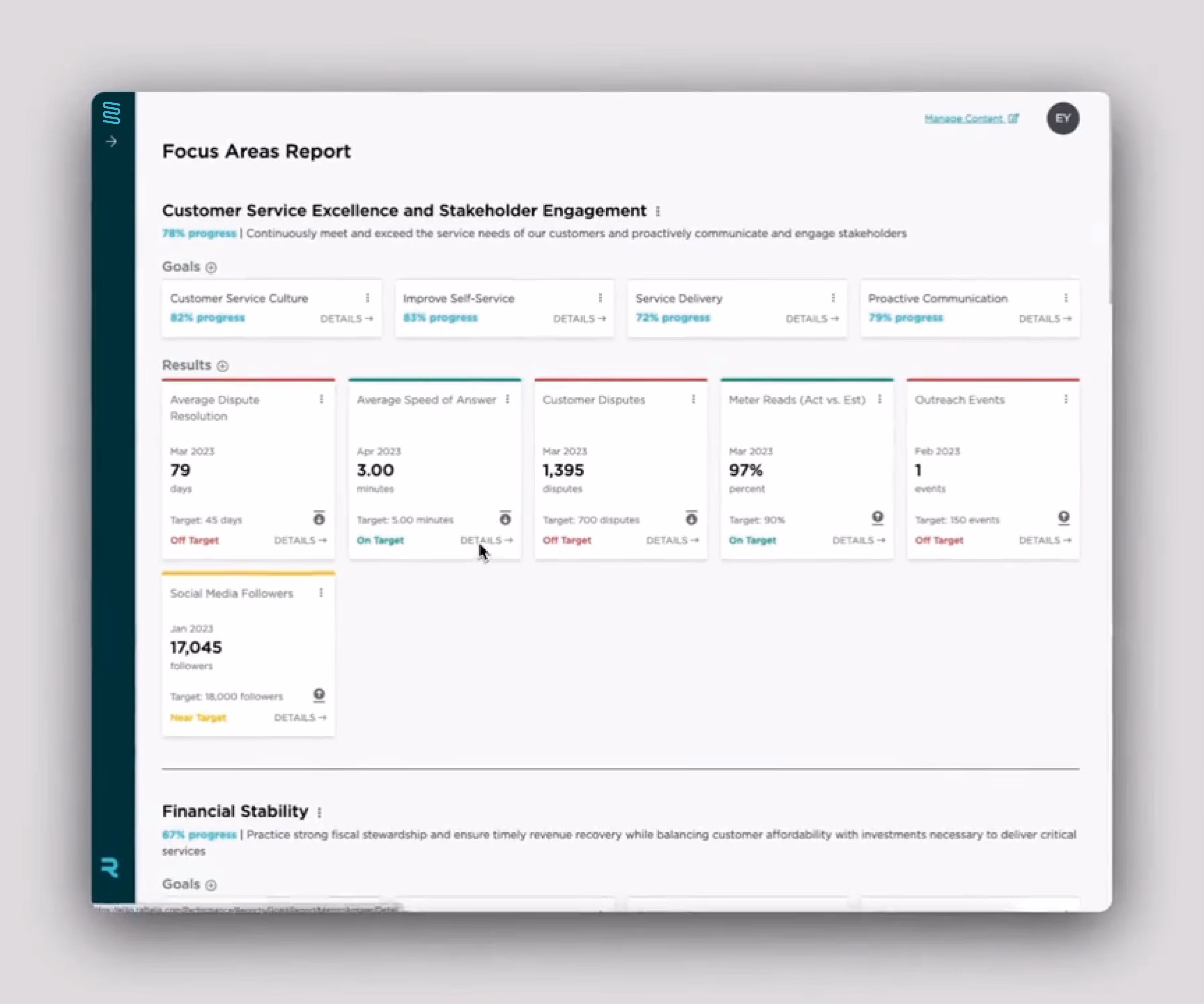 Ellio Performance serves public organizations of all sizes, including municipalities and utilities. You don’t even need a formal plan to implement; if your organization has measurable goals and objectives, you can use Ellio Performance.