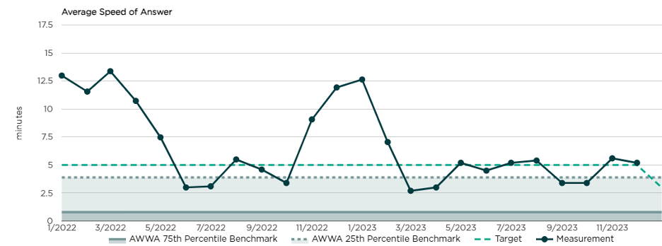 SWBNO is holistically evaluating performance by defining success for each focus area, tracking relevant metrics, identifying targets or goals for the desired outcomes, and measuring progress on a grading scale. The utility is currently using a cloud-based performance management software platform called Ellio to measure both the progress of tactical level implementation as well as their performance around several key performance indicators (KPIs) and inform executive staff and the Board on the overall effectiveness of implementing the plan. The example below shows two years of historical data for performance associated with the average speed of answering customer service calls and even layers in benchmarking data from the American Water Works Association’s Benchmarking Survey for comparison.