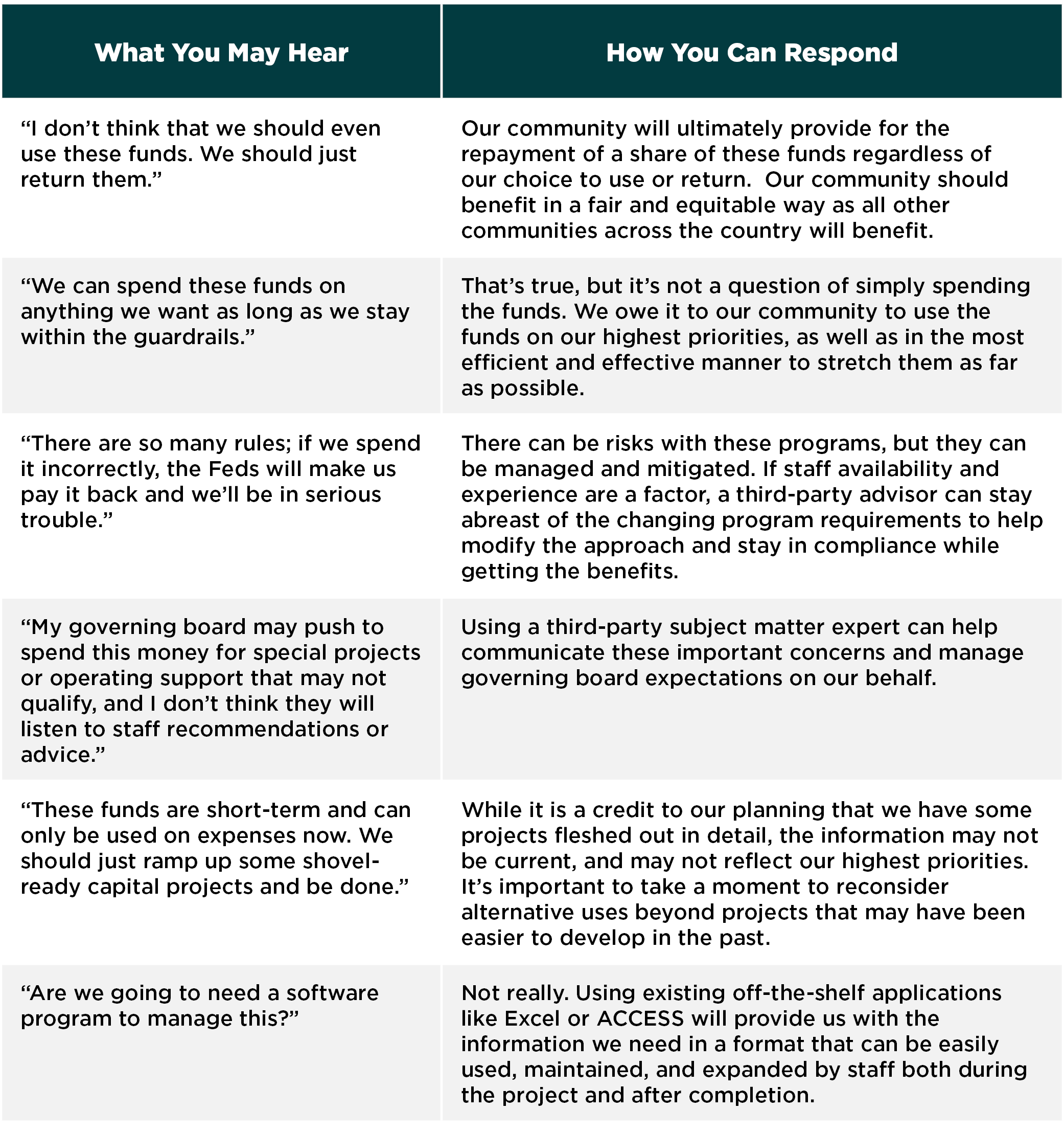 News of rescue funding coming will have governing bodies eager to make plans. Fifty percent of the funding is coming to states for distribution by May 9, 2021. With a whirlwind of activity around this effort it is easy to get bogged down in opinions and misperceptions. Here’s a summary of some of the issues we’re hearing and how you can respond.