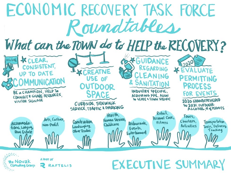 The Nantucket economy is heavily dependent on tourism – by May 2020, hotels and inns closed for all but essential workers and short-term rentals were not permitted. As with much of the country, restaurants were closed and gatherings of more than 10 individuals discouraged. The unknown future for businesses who depend on tours, charters, and long-planned weddings, vacations, and events cancelling, was causing increasing concern about economic long-term viability.The Town formed an Economic Recovery Task Force. Their first task was to conduct community roundtable meetings with various sectors of the local economy.The Town reached out to The Novak Consulting Group (a part of Raftelis) to determine the best way to engage with local businesses. Eight “roundtables” were convened using Zoom, with more than 230 people participating in discussions to share their ideas for how the Town could support various sectors of the Nantucket economy.